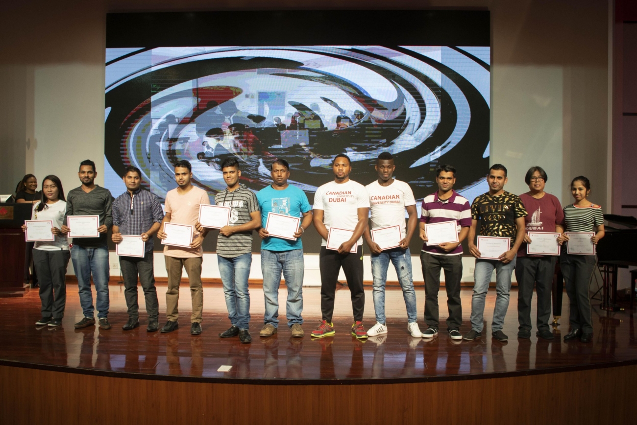 February 4th, 2019 CUD Red Theatre: Members of our valued Support Services Team gathered in the Red Theatre in the presence of His Excellency Mr. Buti Saeed Al Ghandi, Chancellor of the Canadian University Dubai, Professor Karim Chelli, President and Vice Chancellor, other distinguished guests, students and staff to receive their graduation awards after completing a six week development Program to improve their skills in reading, writing, IT and hygiene.